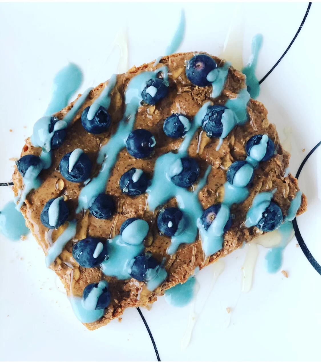 Cover toast with spreadable granola, then top with fresh blueberries, a drizzle of honey, and a drizzle of blue majik coconut butter.